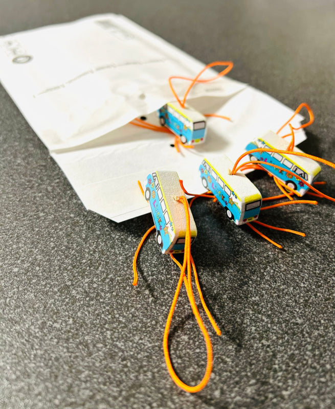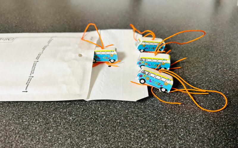 A lucky bus, or camper with which you can go out into the world full of happiness. This lucky bus is a retro design of approximately 33x15 mm.