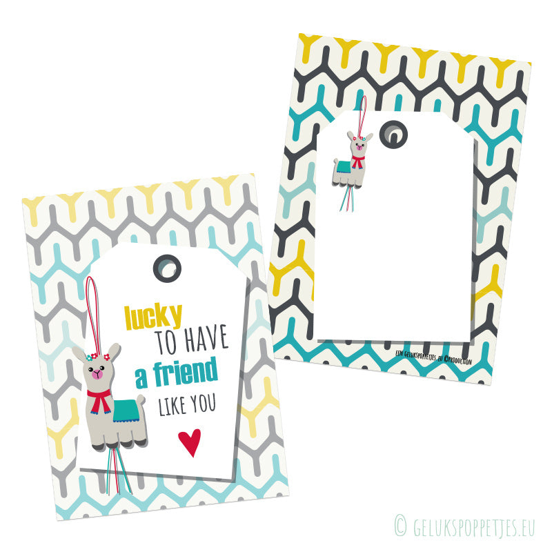 "Lucky to have a friend like you" card featuring our own designed lucky llama. Of course, it's even more fun to give the "real" lucky llama as a keychain with the recipient's name!