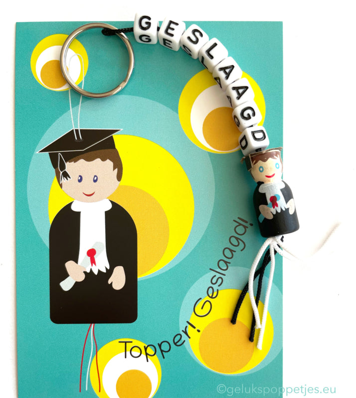 How fantastic! You passed! It's so nice to receive a little bit of happiness: your own lucky professor charm with the "pass" message on it. These lucky charm keychains can also be ordered as personalized keychains, so every graduate gets a unique one.